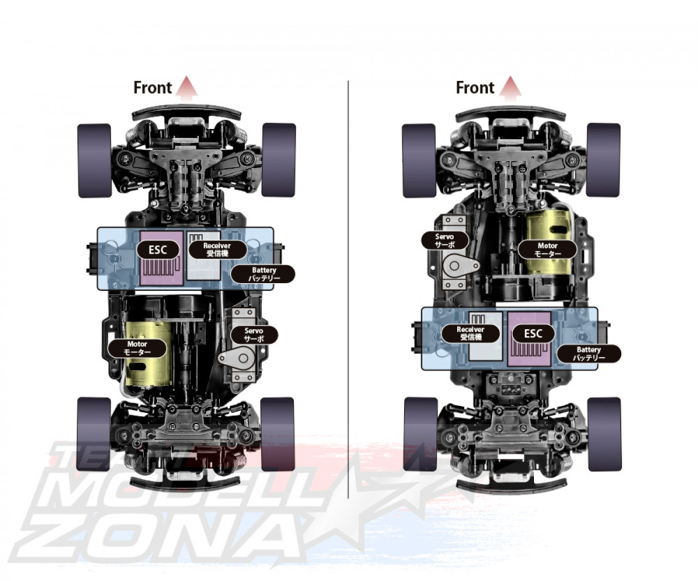 A kompakt, 2WD MB-01 alváz háromféle tengelytávot, valamint első- vagy hátsókerék-hajtást kínál. Ez a modell elsőkerék-hajtású. A 4 kerék dupla lengőkaros felfüggesztése szimmetrikus szerkezettel és súrlódó lengéscsillapítókkal rendelkezik. Az olyan egységek, mint a motortartó, a végső fogaskerekek és a felfüggesztés, megkönnyítik az összeszerelést és a hatékony karbantartást. Ráadásul az akkumulátorcsomag, a motor és az R/C berendezések központi vázról való eltávolítása nélkül egyszerűen megváltoztathatja a végső fogaskerekek és a kormányösszekötő rögzítési irányát az első- és hátsókerék-hajtás közötti váltáshoz; alacsony vagy magas motorpozíció választható a hátsókerék-hajtású autókhoz.